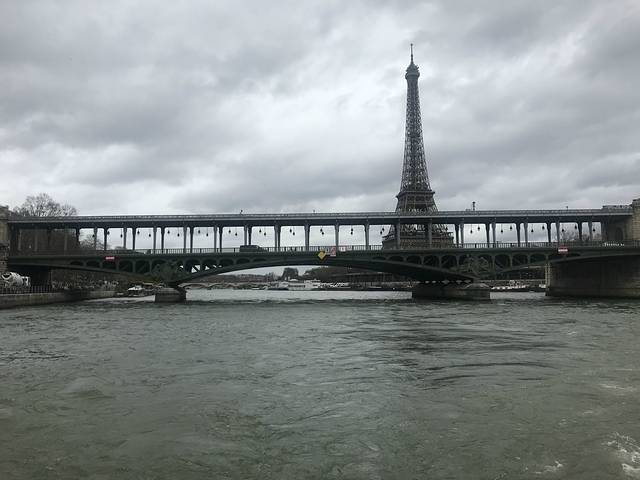 游船经过比阿盖姆桥时,回望埃菲尔铁塔。