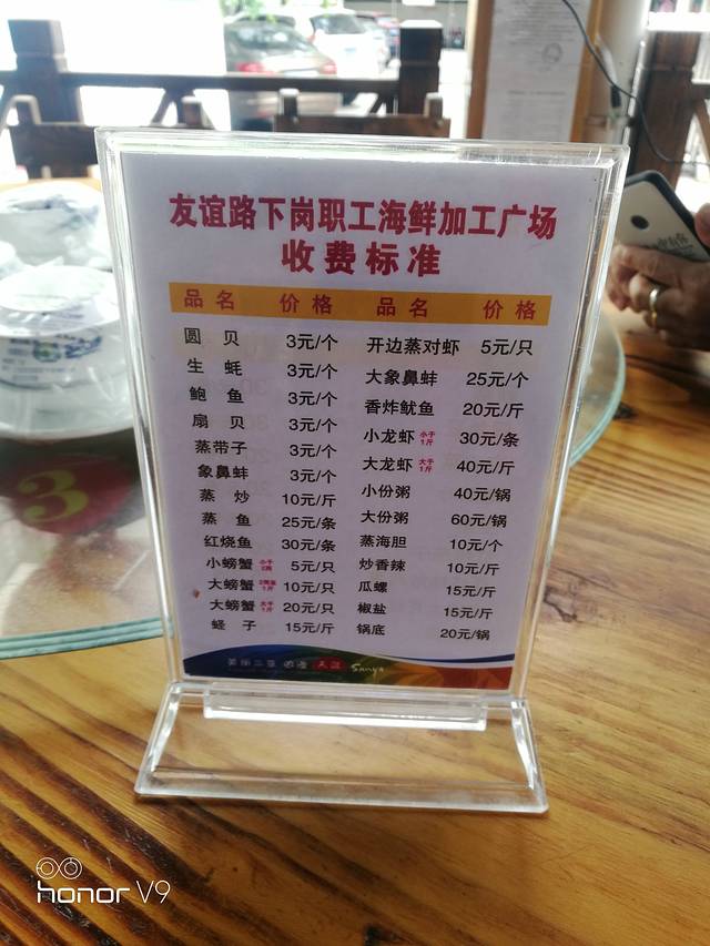 推荐5颗星。我们在第三农贸市场买了海鲜就到附近的友谊路下岗职工海鲜广场加工,走过去也就8分钟左右,海鲜广场不大,都是大排档,环境没网上说的那么差,都是露天搭棚的,没空调,加工费都是明码标价,不过可以讲价,我们选了A栋2号吃的,加工费一共花费了156元,味道做的不错,是在三亚这么多天吃的最好吃的一顿海鲜了,在亚龙湾我也去网红店打卡吃过海鲜,味道真的没这里做的好吃,比这家贵多了。