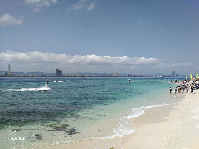吸取南山旅游的教训,提前在去哪儿网报了一日游的团,定了早上8点的团。头天晚上导游会打电话跟你确认信息,上车地点、上车时间、车牌号。成人往返+船票+门票140元/人,60岁以上老人优惠半价72元/人,上车把钱给导游代买,60岁以上老人和0.8-1.2米的小朋友要交占位费的,每人50元(含往返)。如果第一次来三亚,可以选择去次蜈支洲看看。朋友建议我们去分界洲岛,风景也不错,适合小孩子玩,蜈支洲景色是好,但人太多,还烧钱。但是后来想来都来了还是去最有名的蜈支洲吧。去了之后真是应了一句话,没去后悔,去了更后悔。坐车、排队上下岛花费了7-8个小时,实际在岛上也就玩了不到4个小时,到处都是人,那天还特别热,沙滩上遮阳的地方不多,躺椅要200元/小时。看了攻略,中午饭我们都是带饭上的岛,岛上物价真心贵。导游在车上给我们介绍了岛上很多玩的水上项目,因为带着老人和小孩,所以我们都没参加,他们有个套票1300多,所有项目都可以玩,享受VIP通道,不用排队就可以上下岛,我觉得还是比较划算的,只要你时间够。