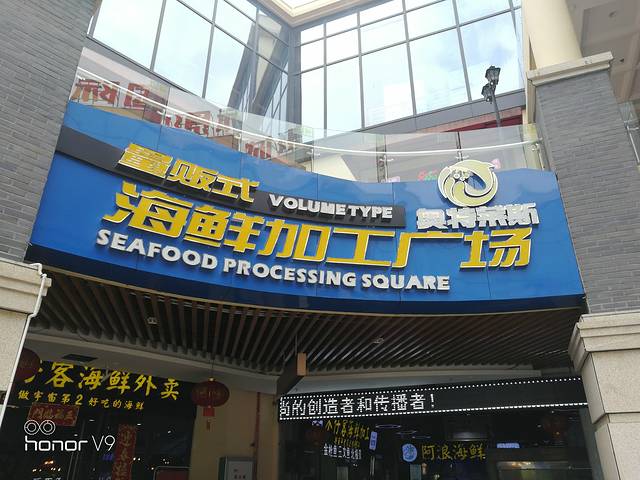 奥特莱斯小镇很大,吃饭的海鲜广场不大,卖海鲜的在中间,围了一圈,海鲜加工店都在四周,你可在中间买了海鲜到加工店让他加工,也可以到加工店点餐后让店家去买来加工,价格提前讲好。这里的海鲜比三亚湾第三农贸市场的贵一点。