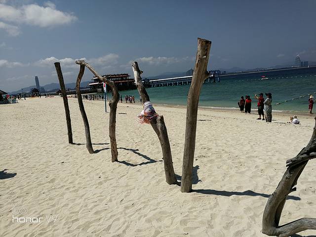 三亚湾海水没有亚龙湾的好,沙也不是那种白沙,不软,一看图就知道了,不过小孩子应该更喜欢这里,这里的沙滩有很多贝壳、海螺还有小螃蟹,龙宝超兴奋,到处挖洞,说要找宝藏。亚龙湾的沙子就只是沙子,贝壳、螃蟹很少,连碎珊瑚都没找到,蜈支洲岛上都是碎珊瑚。
