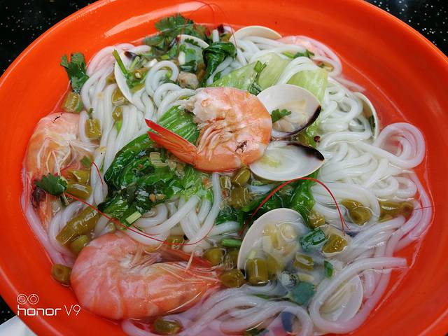 海南小吃主要吃海南粉、后安粉、抱罗粉、陵水酸粉、虾饼、清凉补、炒冰等,很多地方都可以吃,还可以在美团点外卖。第2天早上就在楼下随便找了家吃了碗海南粉,我选的是细粉,跟云南的细米线有点像,但是更软、更细,帽子就是几个白螺加基围虾,味道真是淡的很,还是觉得云南的米线好吃。