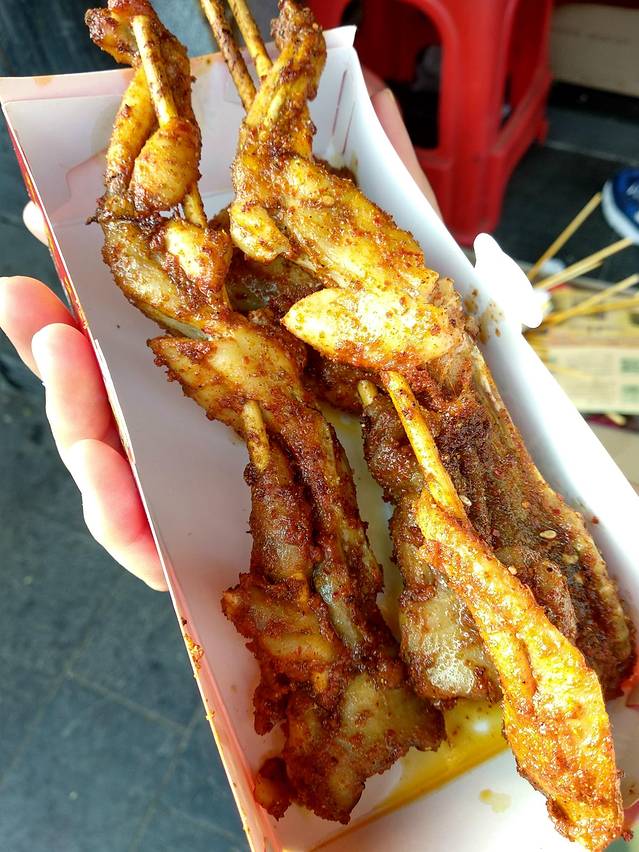 我们尝试了烤猪蹄、李疯子的牛蛙和面筋。面筋是比较推荐的,香辣口味但烤得不干,有质感。牛蛙香料味足,但肉质有点棉,感觉并不那么新鲜。猪蹄浓浓的骨胶原,估计是女士们的最爱吧!