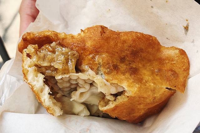 至于排了一个多小时的油饼包烧卖,个人不是那么墙裂推荐。烧卖吃不习惯,馅料水汤汤的,又有比较重的类似五香粉的味道,单吃烧麦引起了我味觉上的极度不适(可能是南北差异),包着油饼吃倒是舒适了许多。一个多小时的排队略显不值。