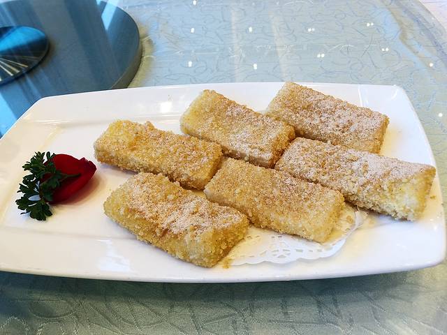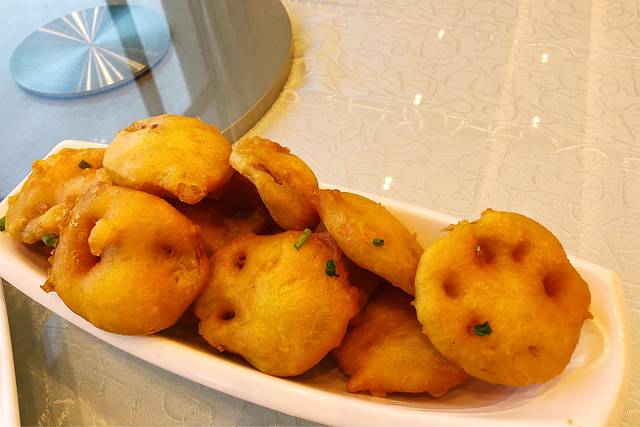 炸藕夹,算是特色菜之一了。藕片有点薄厚不一,夹了一层薄薄的肉糜,外面裹的面糊炸的酥脆金黄,量超级大,其实这种炸面小食,一盘有个四五块就足够了。