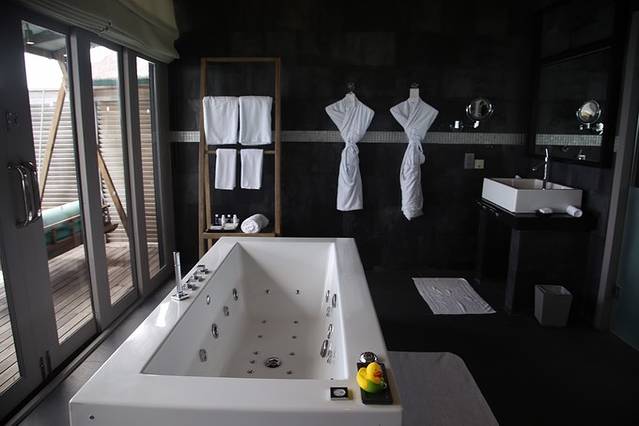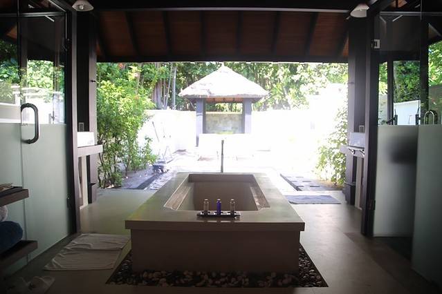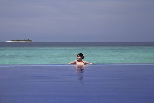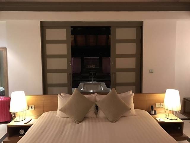 日落水屋的布局和日出水屋的是一样的,只不过朝向不一样。早上管家依旧是十点来接我们换房间,并送了我们一张无边泳池的蜜月饮料券,可以去无边泳池免费喝两杯鸡尾酒。