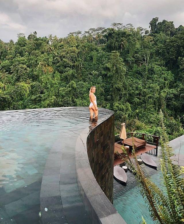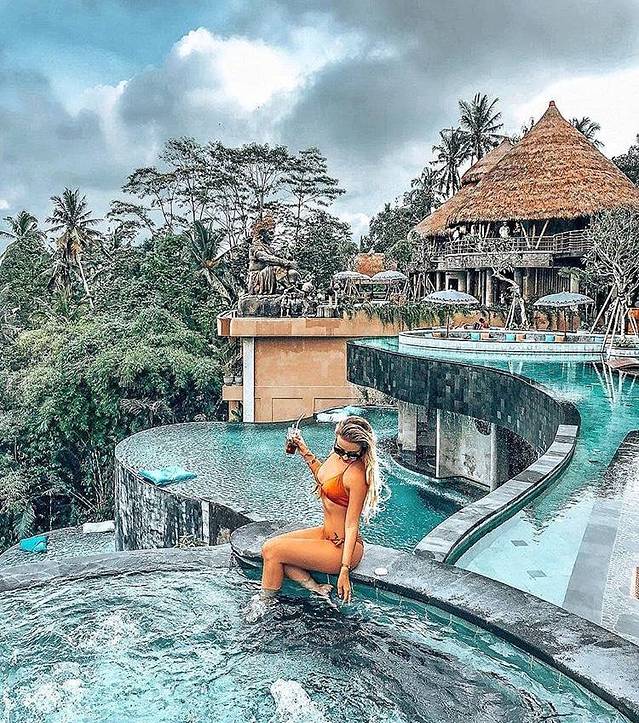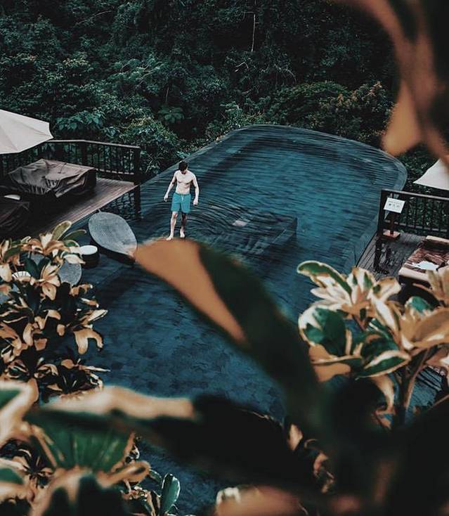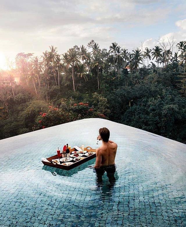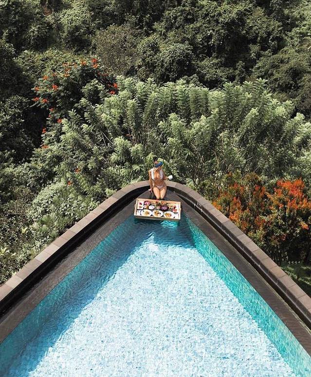优点:在丛林中超大的三阶梯悬崖无边泳池,可以欣赏周围的丛林和水稻梯田,还有提供漂浮早餐。