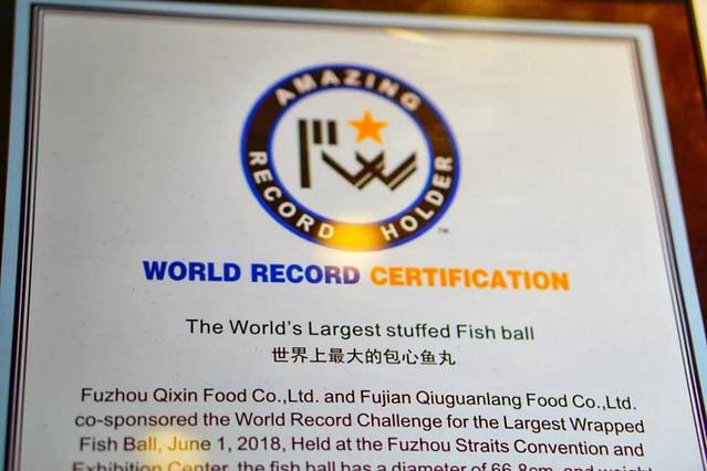 除了“百年老字号”的头衔,秋官郎鱼丸还创下过“世界上最大的包心鱼丸”的吉尼斯世界记录。据了解,这颗“鱼丸王”的重量是128公斤,也就是256斤,直径是66.8厘米,一度成为福州鱼丸界的传奇品牌。