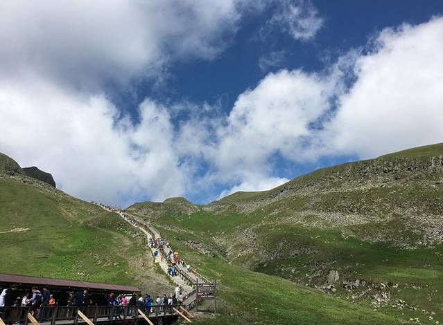 西坡景区车不到山顶,没有别的景点中间不会停,一路上山景色很美。下车还有一段需要自己爬,这里算是海拔有些高的了,没走两步就气喘吁吁,一想到天这么好,别一会有云飘过来抢我看天池,努力往上爬