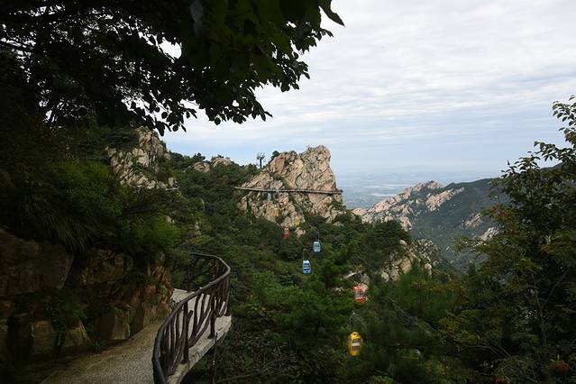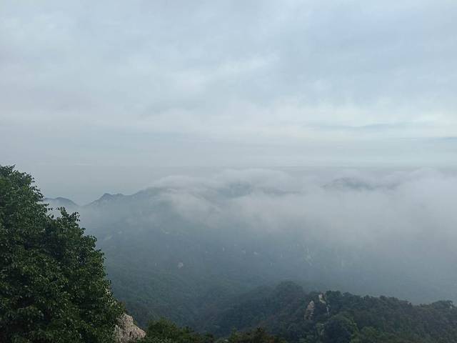 继续往上走,雨渐渐就不下了,我们爬了一段陡峭的台阶后,到了鹰窝峰。远看鹰窝峰周身被薄雾笼罩,仿若仙境。看其本身,山体犹如一劈山巨斧,直矗的天地之间,对蒙山有了解的小伙伴说,坐车虽然也能看到鹰窝峰,但是绝对没有在步行路上观赏的角度好,都说“不到鹰窝峰,枉为蒙山行”这算了没有白来一趟了。