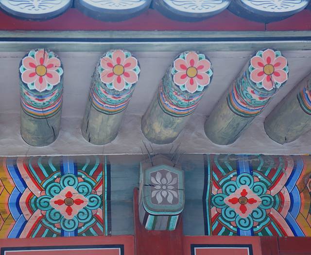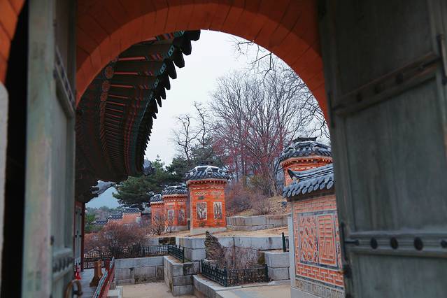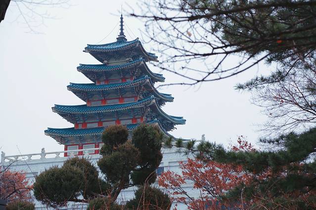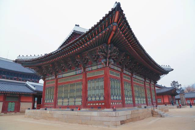 当时因为严格遵循与宗主国中国的宗藩关系,所有建筑都以丹青之色来区别于中国皇宫的金黄色,加之景福宫的大部分建筑都在战乱中被焚毁,很多都是后期修建的,便是眼前的这些了。