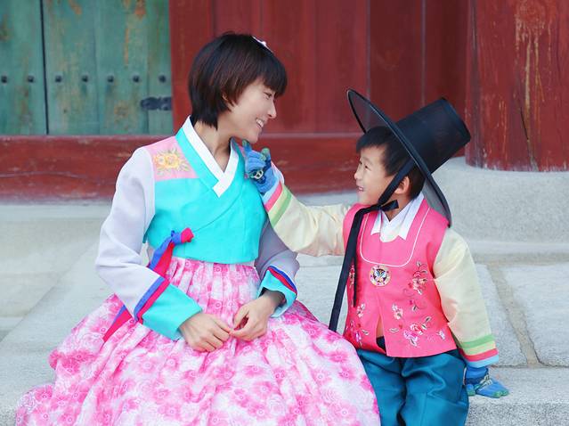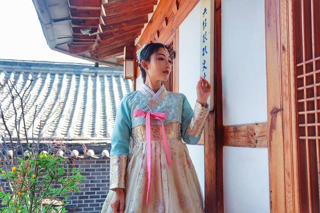 那是我第一次穿韩服,一头短发加上选了比较清新的粉蓝色,其实是没有什么韩式味道的,景福宫既然是宫殿主题,还是建议亲们选择传统或红金蓝为主色调的韩服,这样会显得更富有浓厚的韩国传统色彩,也更有气势。总之穿韩服来景福是体验韩国宫廷特色的好选择。