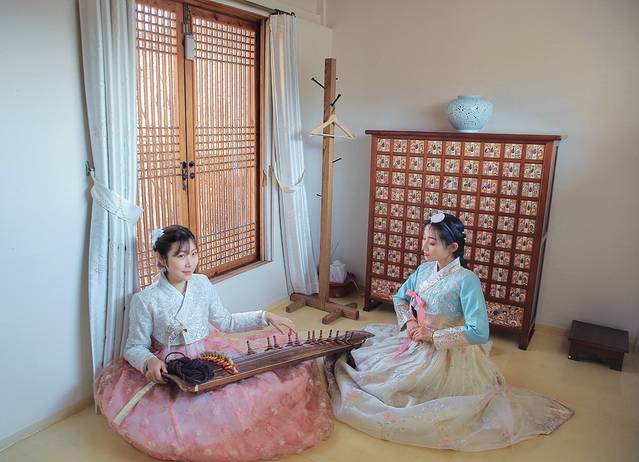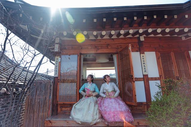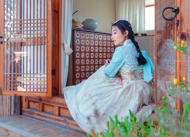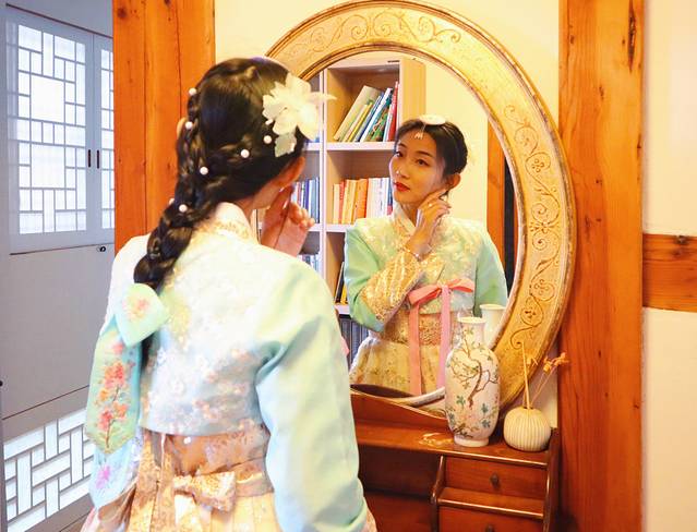 没有了大城市的繁华,空气中弥散着质朴的生活气息,除了路边传统的韩屋、韩服租赁店和传统手工坊,还有现代风格的咖啡店和西餐厅,寻一家韩服店开始换妆,只是红唇配韩服,被好朋友笑作是奸妃横空出世,狭路相逢戏精相遇,看来这出 “2019年年度宫斗大戏”分分钟开演,穿上韩服浑身都是戏,活脱脱一出女二号成功逆袭女一号,灰墙白瓦间现实版塑料姐妹花~