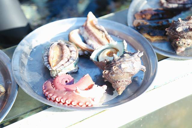 海女们把捕的海货当时就会卖掉,或者在她们的小餐厅直接加工供客人品尝,下山时天色已暗,山下摊位上会有一些漂亮的石头和纪念品,样子很韩国