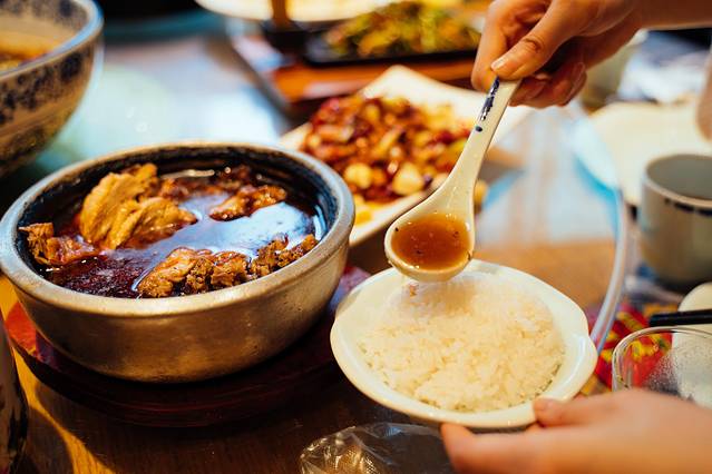 用冒烤鸭的汤汁拌饭是绝配完美,,一口气吃三碗饭完全莫得问题!