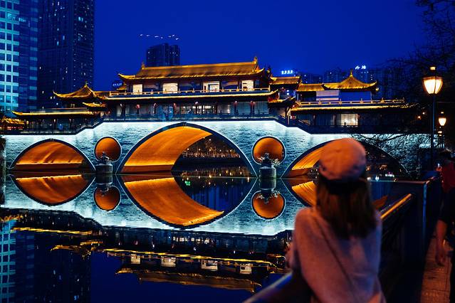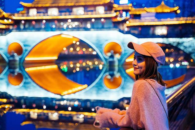 九眼桥一共有两座风格别致的桥,一座是现在化的三孔桥,闪烁着蓝色的光芒,一座是宫殿式的桥,金色的灯光将它衬托着更加气势恢宏。