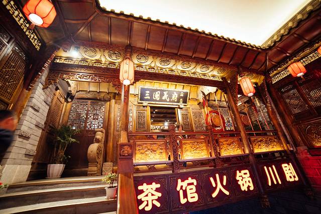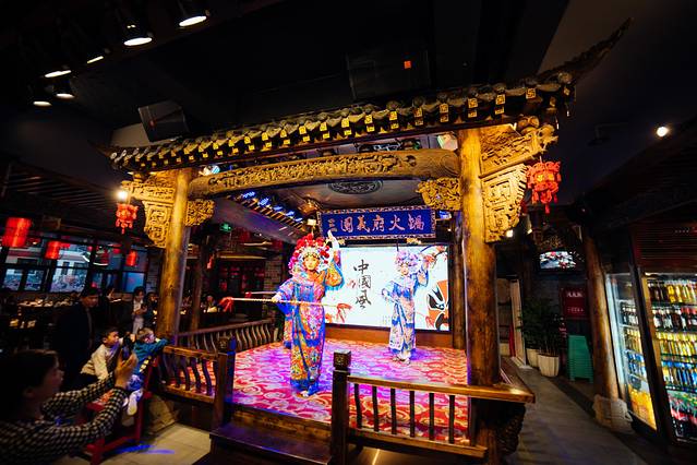整个店的环境上处处体现了三国文化风情,灯笼、木门、木窗以及雕刻和亭子等等古建元素在这家火锅店体现得淋漓尽致。而且这家店晚上6店40有川剧表演,所幸我们提前就到位,选了一个好位置。吃着火锅还能免费赏着川剧表演,巴适得飞起!