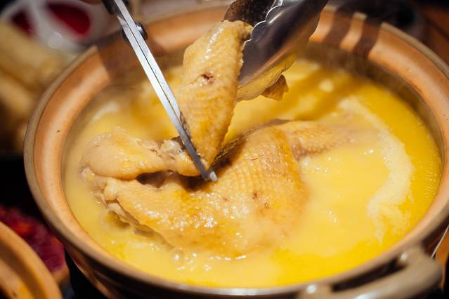 其次锅底也有所不同,除了传统的红锅外,白锅就不再是简单的菌汤锅,番茄锅之类的,取而代之的是新颖的“海鲜锅底”和“花胶鸡锅底”,这一次我们先选择了后者,服务员介绍到这个锅底原料是精选上等东海金钱鳌胶,加半只一年以上的走地鸡,烹煮12小时以上,富含胶原蛋白。