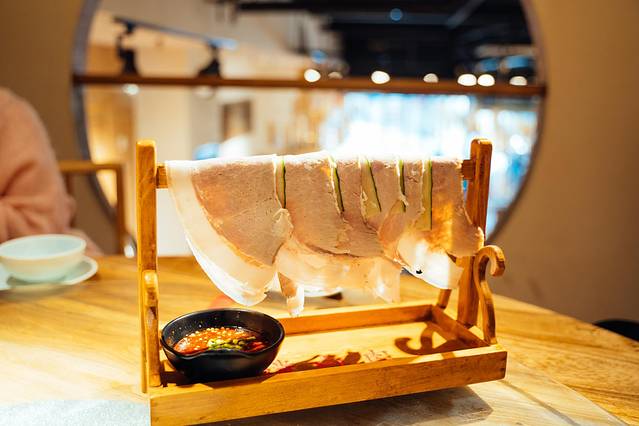 「饕林非遗白肉」这道菜摆盘就很精致,增加了菜品的立体感,大片的白肉提现出师傅的刀工了得,味道也巴适。话说这么大片完整的白肉真是没见过哦~