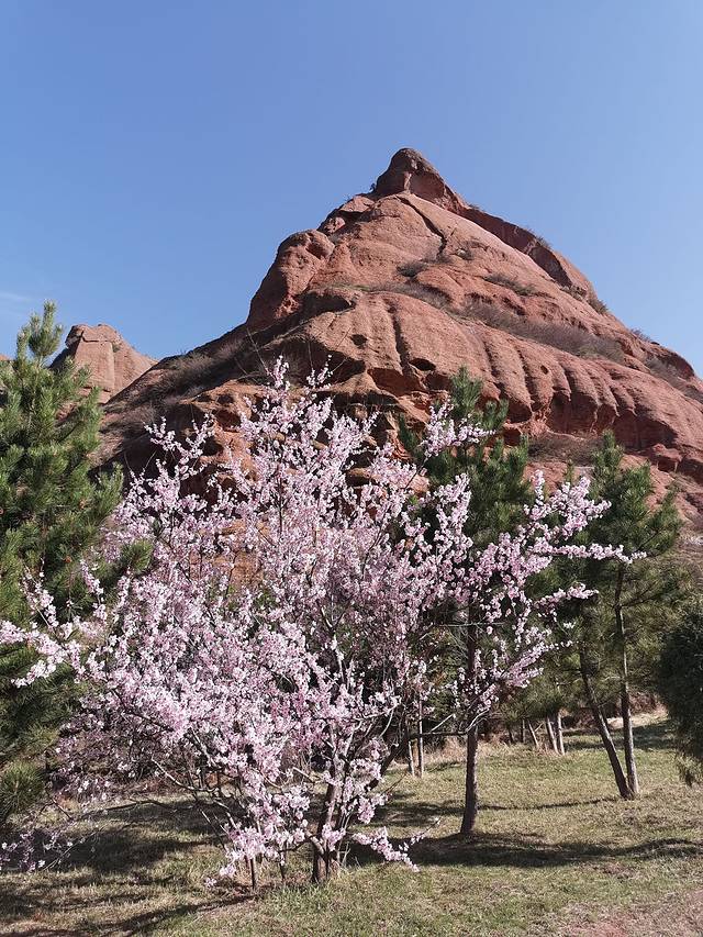 进入四月下旬,桃红梨白杏粉的春色已然落幕,想看桃花,只能到高山远岭来寻觅。固原旅游景区火石寨的桃花一簇簇开满山,蓝天下显得更艳。桃花开在树林间,桃红松绿更耀眼。桃花开在丹崖边,桃花红丹霞更烂。