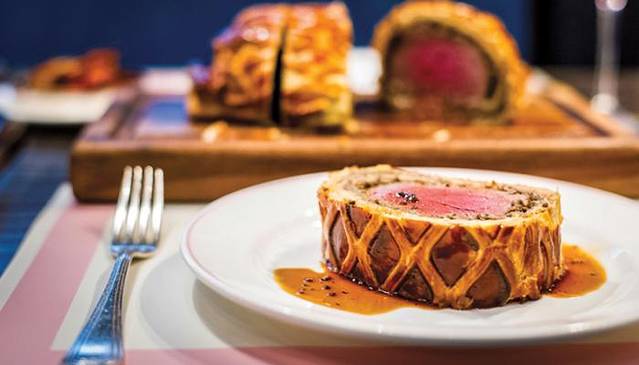 主菜威灵顿牛肉(Beef Wellington)是Bob Bob Ricard的标志性菜肴之一,威灵顿牛肉简而言之就是脆酥派皮包裹厚牛肉,一道威灵顿牛肉需要足足45分钟准备。这道菜起源于19世纪,打败了拿破仑的威灵顿公爵因为嗜吃牛肉,又偏爱吃鹅肝酱和松露,所以在凯旋归来的宫廷宴会上,御厨特地为他做了这道菜,结果惊艳所有嘉宾。如今这道菜不仅成为招待贵宾的英国国宴菜肴,还进入了普通人的餐桌。