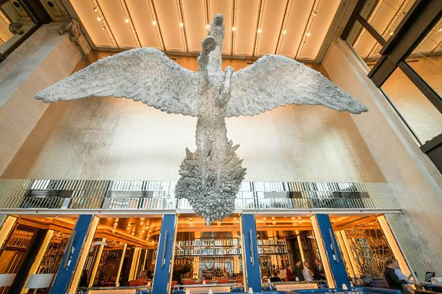 Brasserie of Light最引人注目的标志,是餐厅上空那件腾空而起的水晶飞马雕像,高达7余米,翼展9余米,由英国当代艺术家达米安赫斯特倾力打造,是目前伦敦体量最大的雕塑作品。据说,水晶飞马的设计灵感源自古希腊神话中长着翅膀的神马Pegasus,凡是被它踩过的地方就会涌出泉水,饮之将会诗兴大发。
