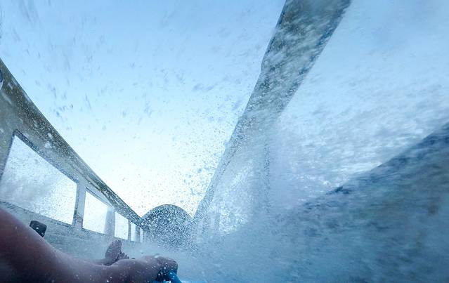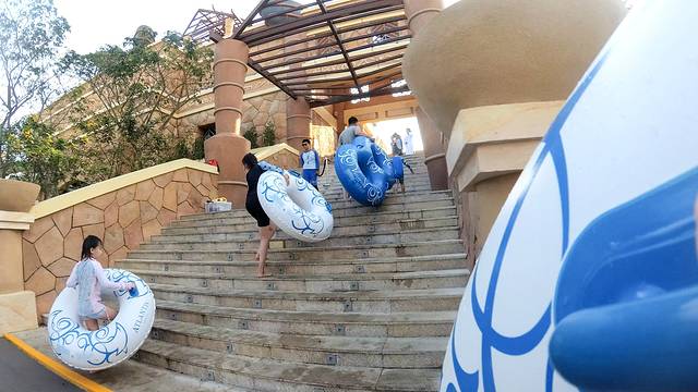 之后又去玩水上过山车,三个人很适合玩这个项目,刺激程度中等。三人皮筏,按体重来乘坐,轻的坐最前面。那我就是坐在最前面的那个人了。坐在皮筏上,随着动力平缓而上,突然立马滑入管道,进去管道时忽暗忽明,我完全迷失了方向感,突然水流的倾下,感觉冰凉又刺激。玩了一遍不过瘾,再多玩一次。