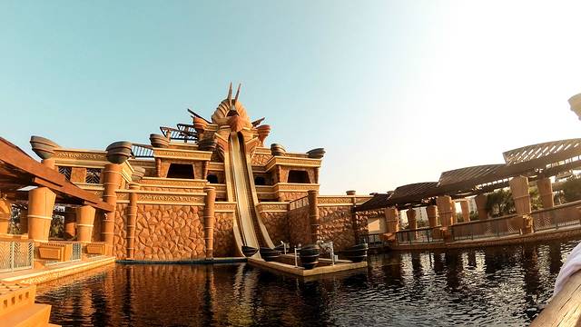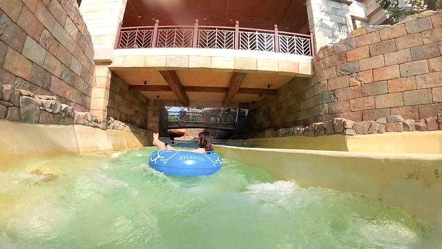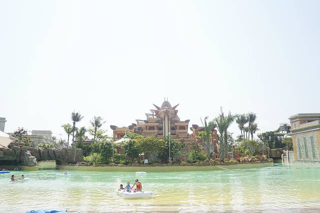 我和闺蜜们决定先从温顺的游乐项目开始,我们先是去漂流,这里有双人皮筏,也有单人皮筏。我坐在皮筏上缓缓跟着水流走,来到了漂流的场地。随着水流加大,皮筏游的越来越快啦!时而平缓时而摇晃。翻越一个又一个小浪,被水拍打后的我全身都湿了。水速平缓下来的时候感觉很惬意,因为沿途可以看到亚特兰蒂斯的美景。