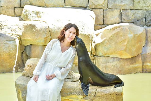 训育员介绍完成后,就是和小海狮互动时间了。我坐在小石头上,在训育员的吹哨下,看小海狮俏皮地对着我吐舌头。哈哈哈,还给它亲了下小脸蛋,湿答答,很水润的小嘴巴。