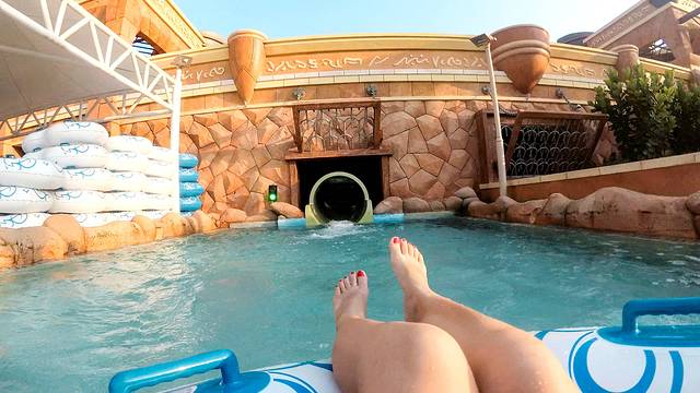 在亚特兰蒂斯,一定要去水上乐园狂欢呀!这里有各种刺激的水上游乐项目,出发水上乐园前我就在房间换好泳衣了,外披个浴袍就能出门。正午时分,火辣辣的太阳正猛烈普照大地。
