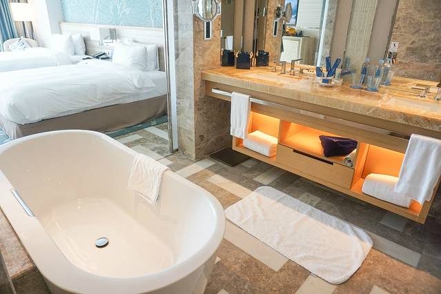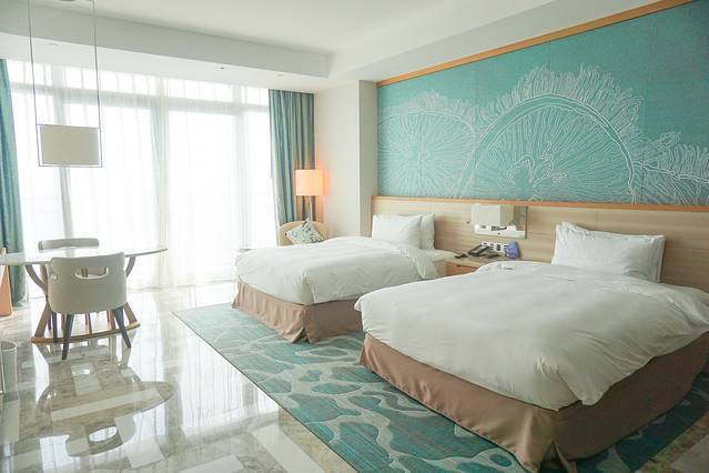 如果觉得上万元的房间太贵,平民价格的普通海景双床房也是不错的。价值2000多块一晚上,我们3个人入住所以选择了双床。