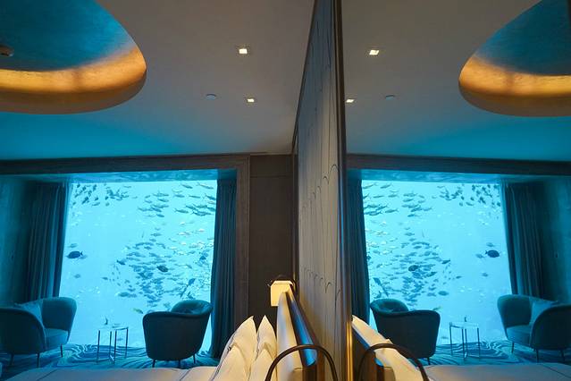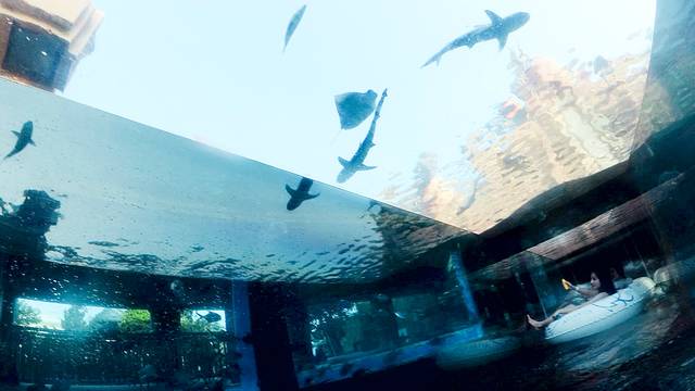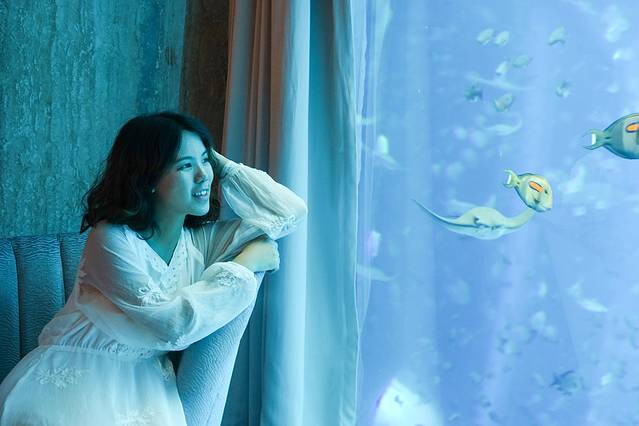 坐在椅子旁边或是泡在浴缸里看着鱼群游过,小鱼大鱼们都丝毫不害羞地从你眼皮游过。晚上和这86000条生物共眠是种神奇的体验!