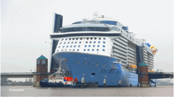 3月20日:经过严格的系统测试,光谱号沿爱母斯河从船厂通过彭贝船闸,第一次走向她的人生大海。这艘拥有16层甲板的巨轮需要在河水有足够的深度,还要拆掉河上的桥,才能完成移送过程。