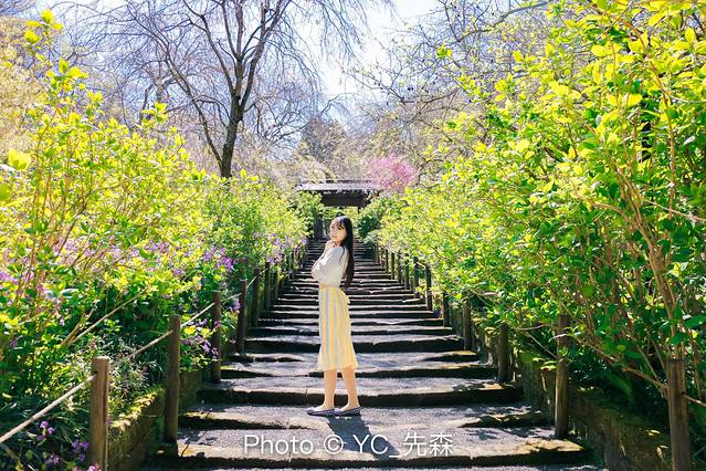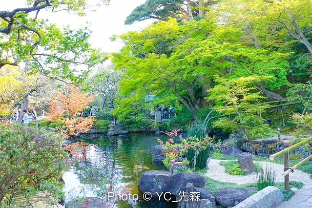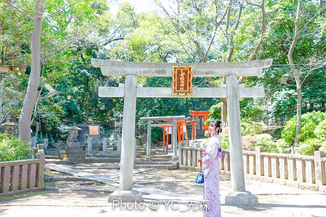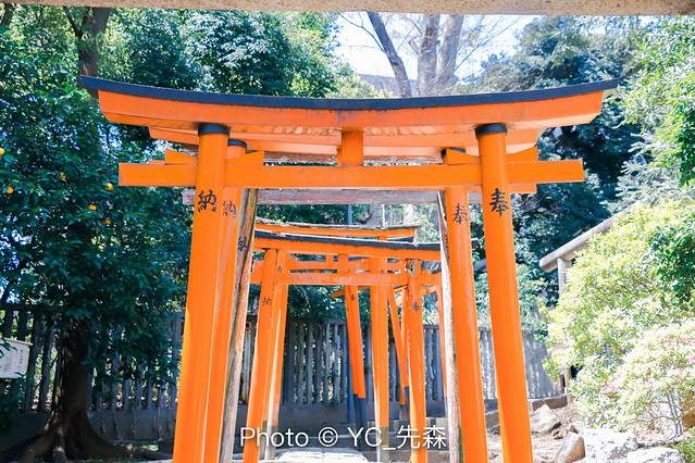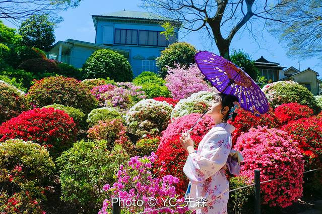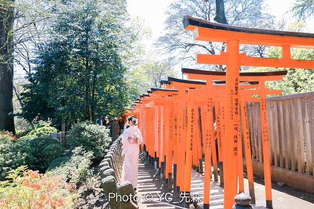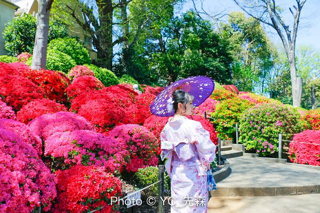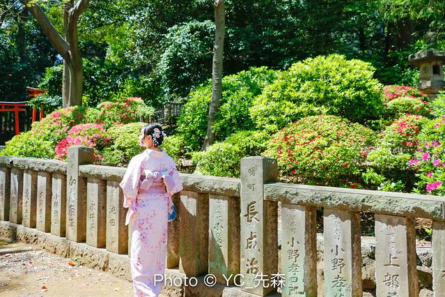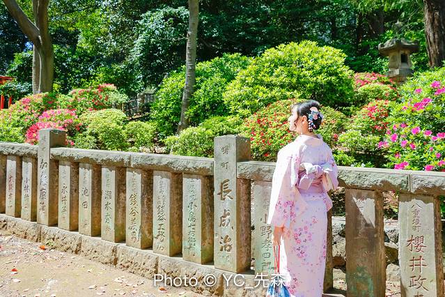 至于和服的拍摄地,这次我们没有选择千篇一律的浅草寺,也没有图省事儿去上野公园,而是选择了小众的根津神社。这里是翻版的伏见稻荷大社,即使不去京都也能看到经典的鸟居。我们去的时候正好还是杜鹃花盛放的时节,满眼的杜鹃花五颜六色,真的惊艳了!