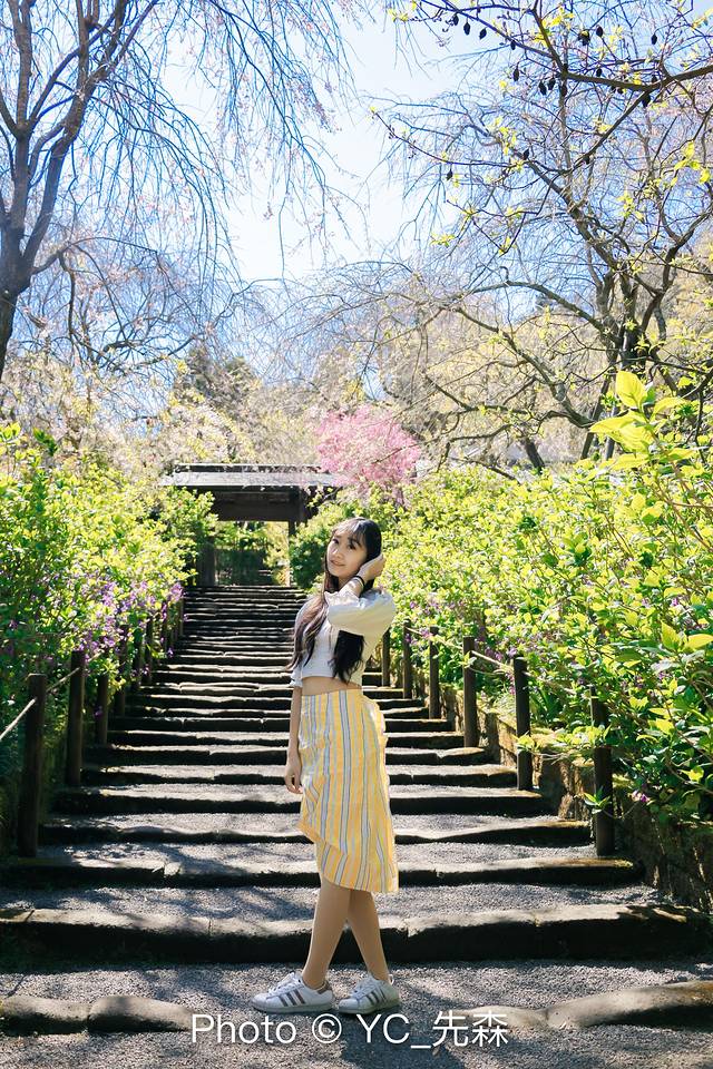 4月中旬的东京天气并不是非常暖和,怕冷如caelyn同学,还是“心机”的穿上裸色厚绒裤+帽衫,拍照也看不出来,搭配这样的景色还挺合适。
