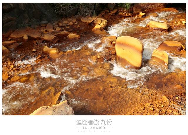 在我们等车的路边的这条小溪,就是它源源不断流去海里,才造成了阴阳海的景观,可是可以得非常明显,从矿山山上流下来的这条受污染的水,已经把整个河床都染成了金黄色