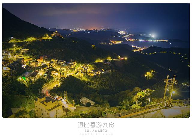 九份老街望出去的山城夜色,蜿蜒曲折的山路像一条丝带绕着山里
