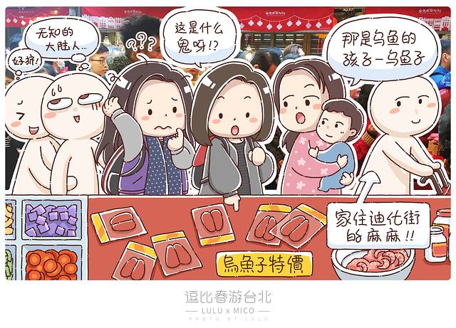 在年货大街里凑热闹的我们,对各种没见过的食物充满好奇,哈哈哈,不过友善的当地人也会热心的和我们介绍当地的特色产品~其实大部分的 台北 民众都是待大陆人非常和善的,这是事实。