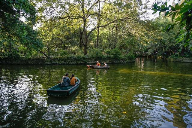 慢慢走进会发现有人在划船,春日的阳光洒在水面上和人们的身上,印着波光粼粼,很是一幅优美画卷。