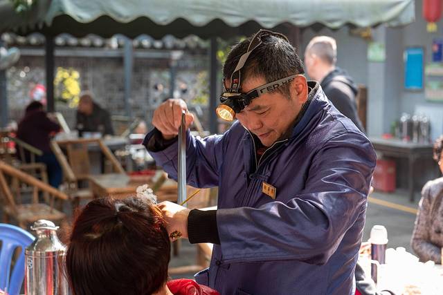 我们没有走累,但也想留在这里坐一坐,有聊天的、抽烟的、喝茶的、打牌的、看报纸的...走进这里,心情一下就放松了不少,喝了茶,还体验了一把成都特色的掏耳朵,很快就结束,而且价格也不是很便宜,想体验的可以体验一下,想省钱的还是不用试了。