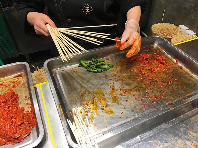 在后厨里,阿姨手速飞快地串着牛肉,安全卫生又迅速!