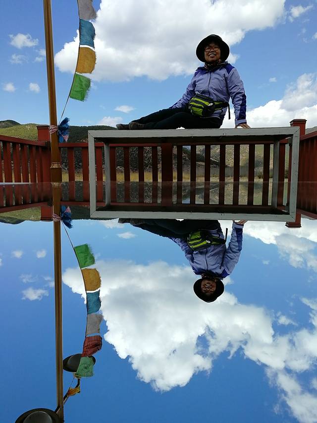 12:00出来准备下山,此时山上天气也变好了,太阳出来了。排队坐索道下去,又坐了大巴,我们到达蓝月谷,那边的景色很美,蓝天映在水里,好看得都有点不像真的,像画一样。雪山似乎与湖泊相连,白雪皑皑与湖光碧蓝相得益彰,美透了。游客们都围坐在湖边,照相,发呆,好不惬意,有个日本女游客还让我们帮她拍照,她也帮我们拍了几张,一派祥和友好。此时看到了一头牦牛,据说牦牛只能在海拔那样的高度才能生长。