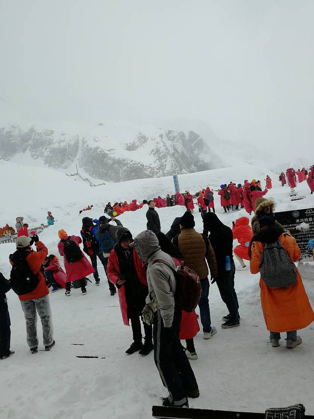 我们早上7:00就从酒店出发,包的酒店的小轿车,200元来回,8:15就到了索道那里,然后排队,等待,10:00我们坐上了索道,也就10分钟不到吧,我们到达了玉龙雪山的观景台。到那儿还是挺震撼的,雪山雪白一片,苍茫的雪的世界看起来很神圣,离天感觉很近,天气很冷,还下着雪,手都冻的疼,真的是山上山下两重天,山上是冬天,山下是春天,大自然真的很神奇。雪山顶时隐时现,太阳出来就看见,太阳不出来就模糊,我们只能一会儿出去,一会儿进来暖和一下,在山下租了棉大衣穿上还觉得冷,还有氧气瓶不停的吸着。氧气这玩意,吸了舒服一点,不吸好像也没事,我和我那位师兄共享一瓶,但她只吸了一口,全让我吸了,感恩师兄谦让。