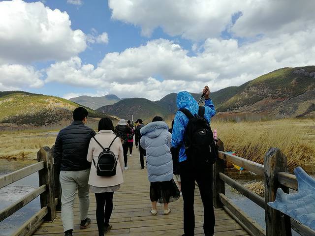 上岸后,驱车去草海和走婚桥,到那里已经是11:45了,摩梭人奉行“男不婚,女不嫁”——并不是说男女都不找配偶,而是实行“走婚”制度。如果情侣来的话,就一起牵手走过这条桥吧,或者秀个恩爱,背起或抱起女朋友走完,千万不要掉下来,不然怕是要挨打。我们去时草海的芦苇干枯,黄黄的长长的倒是别有一番风味。下午1点到达住处,2点返回丽江。