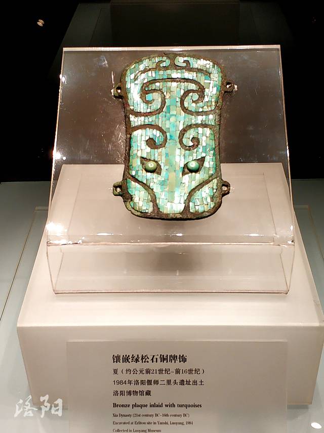 镶嵌绿松石铜牌饰:夏代,高16.5厘米,宽8-12厘米,1984年洛阳偃师二里冰龙遗址出土。盾牌形,面微凸起。正面以长方形绿松石片规整地镶嵌成兽面纹。铜牌两侧上下有相互对应的四个半圆形穿孔,可系绳。该铜牌制作考究,在背面没有任何依托的情况下由几百块绿松石镶嵌而成,历经3000年未松动一块。显见其镶嵌工艺技术之高超,是极罕见的艺术珍品,更是我国已发现最早,也是最精美的镶嵌铜器。