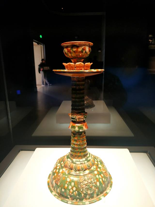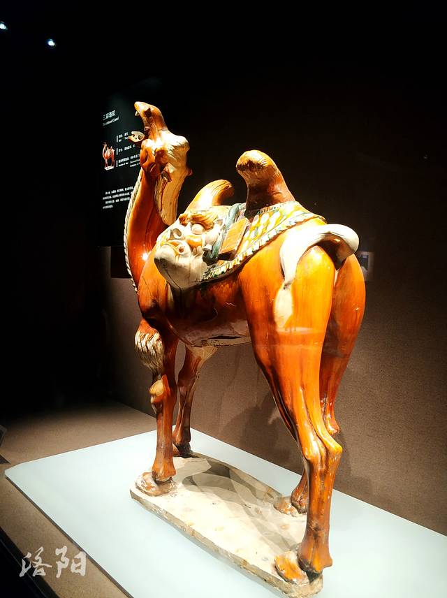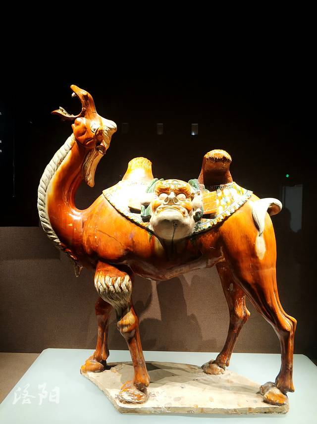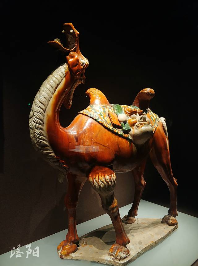 唐三彩骆驼:唐代,高88厘米,长76厘米,1981年龙门安菩夫妇墓出土。颈上曲,头昂扬,张口嘶鸣。背上垫花毯,双峰间搭兽面托囊,囊的前后有丝绢,丝绢两 头分别系有小口瓶、鸡头壶、干粮袋和肉块。骆驼背负托囊、丝绢,漫步身前进行,形象地再现了中国丝绸之路对外贸易的情形。
