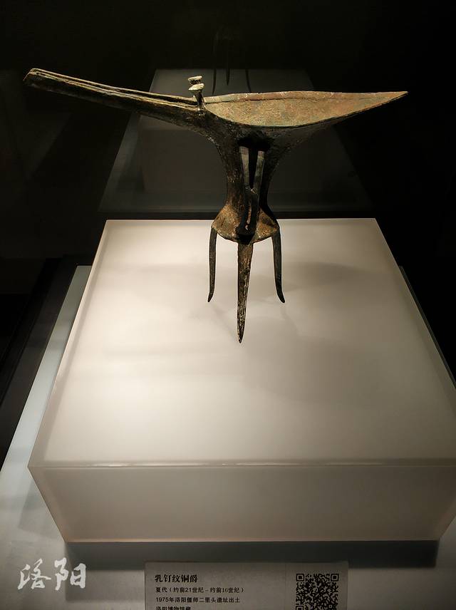 乳钉纹铜爵:夏代,高22.5厘米,1975年洛阳偃师二里头遗址出土。爵长流,尖尾,束腰,腹底椭圆形,有半环形鋬,三足细长、外撇。腹部一侧有五枚横排乳钉。由于该爵形体较高,加之流尾间距离较长,因而产生一种舒畅、洒脱之感。这是我国目前发现的时代最早的青铜器之一,当为稀世珍宝。