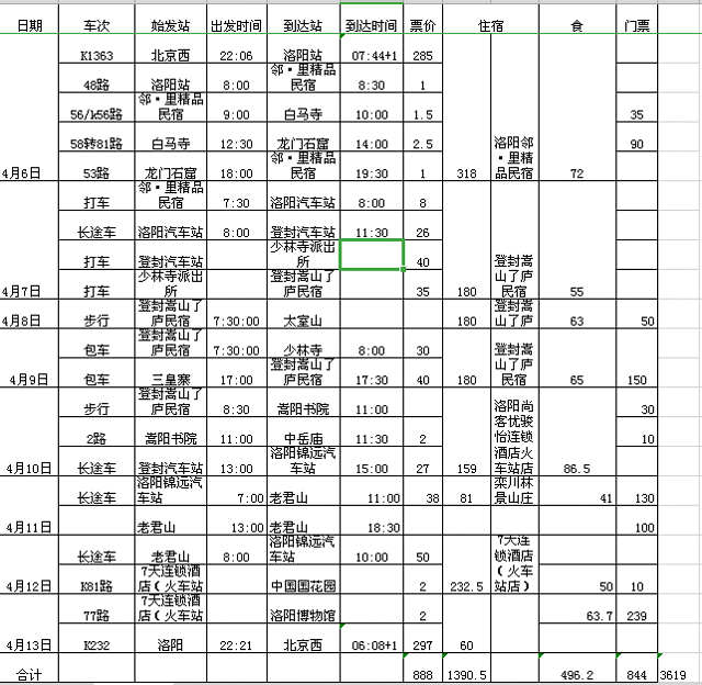 此次行程的所有线路和花费如下: