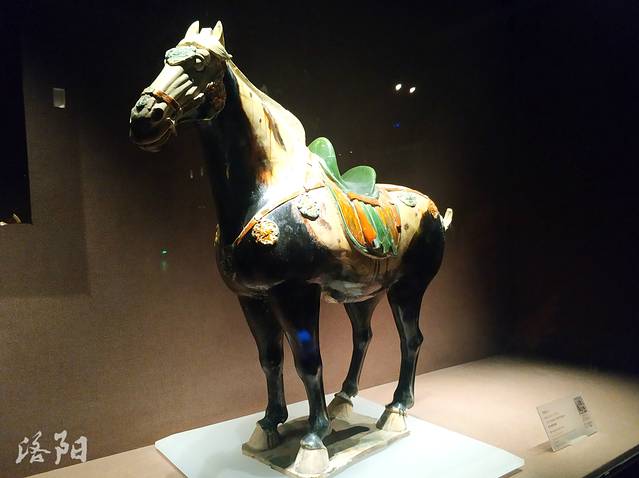 三彩黑釉马:唐代,高73厘米,1981年洛阳市龙门安菩墓出土。马能役善战,又较易驯养,在古代军事、农业等 方面起着重要的作用。唐代尚马之风极盛,唐玄宗曾选择西域良马和中原骏马,令画师摹绘。三彩艺匠用熟练的技术和灵巧的刀法,塑造出各种骏马形象。这匹黑釉马膘肥雄浑,造型矫健有力。黑釉马极为少见,是难得的珍品。