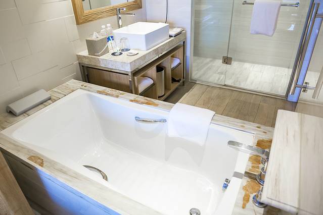 酒店的客房面积很大,进门的右手边是卫生间和浴缸,客房外面还有一个大大的阳台,可以直接看到酒店中央庭院的热带雨林,也能看到一部分的海棠湾的海景,不得不说700元每晚的价格真心很划算,可惜的是进门便把东西扔乱了,拍客房的照片不好看,就没有拍床上了,还请大家谅解。